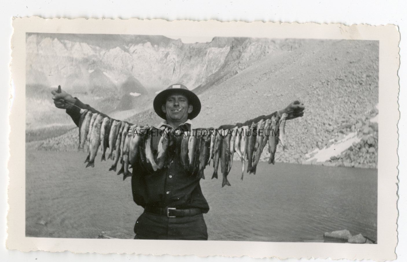 Photo of a man with a stringer of trout stretched between his two outspread arms. He is wearing a hat and has a cigarette in his mouth. There is a lake in the background and rocky skree.