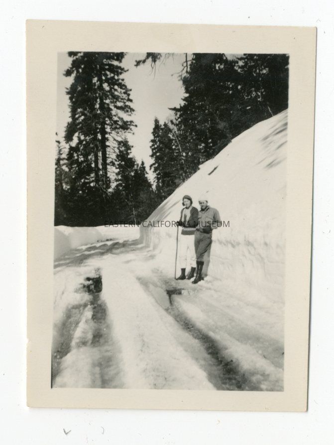 Photo of a man and a woman hiking alongside a snowbank. They are walking on a paved road. She is holding a walking stick. Location unknown.