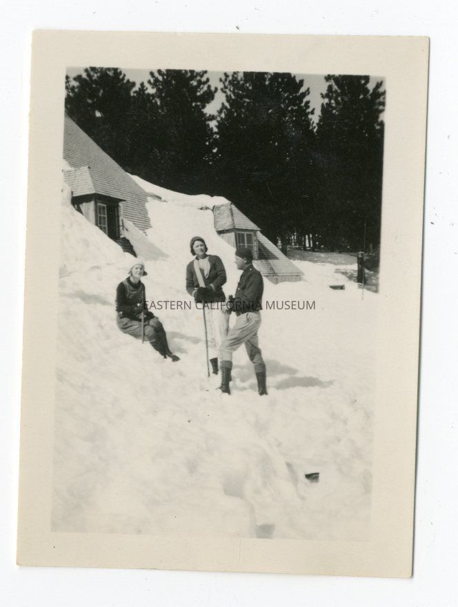 Photo of three people standing next to a snow covered building. The snow is up to the roofline and only two dormer windows are above the snow.
