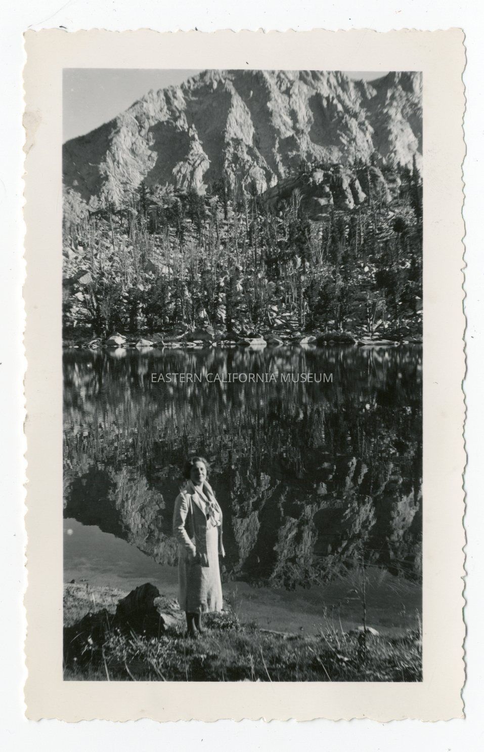 Photo of a woman in a dress standing on the shore of a lake. The mountain on the other side is reflected in the surface of the lake. Written in pencil on reverse: Gilbert Lake.