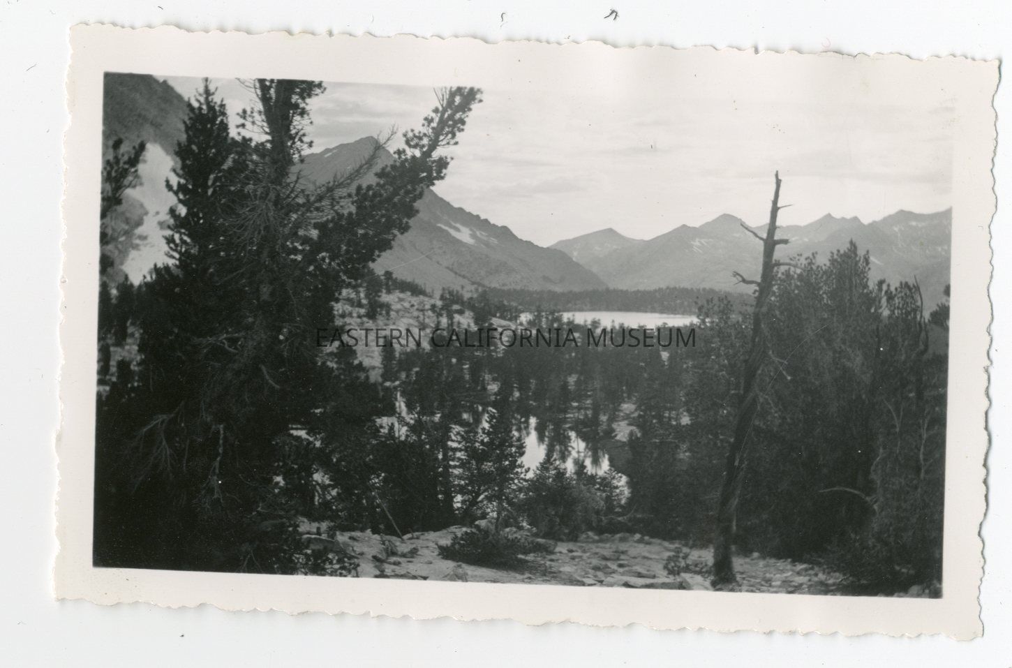 Photo taken from a high vantage point of two lakes surrounded by trees. Mountains in the distance. Location unknown.