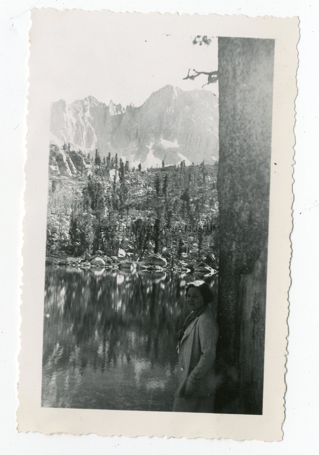 Photo of a woman with her back to a tree standing in front of a lake with mountains in the background. Written in pencil on reverse: Gilbert Lake.