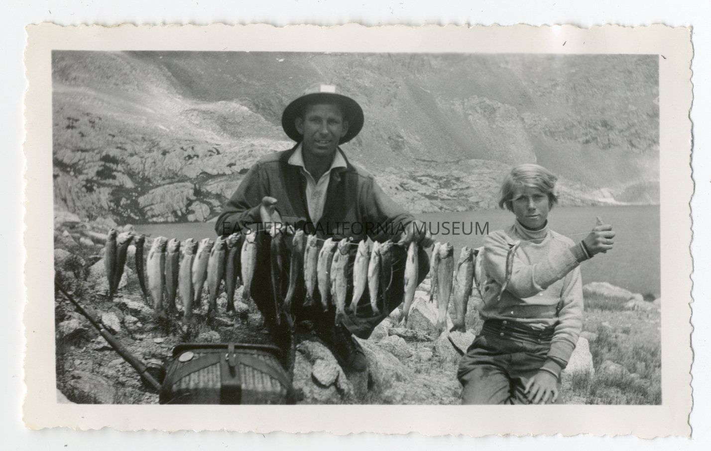 Photo of a man and young man displaying a stringer of caught trout. There is a fishing pole and creel in the foreground.There is a lake in the background. Location unknown.