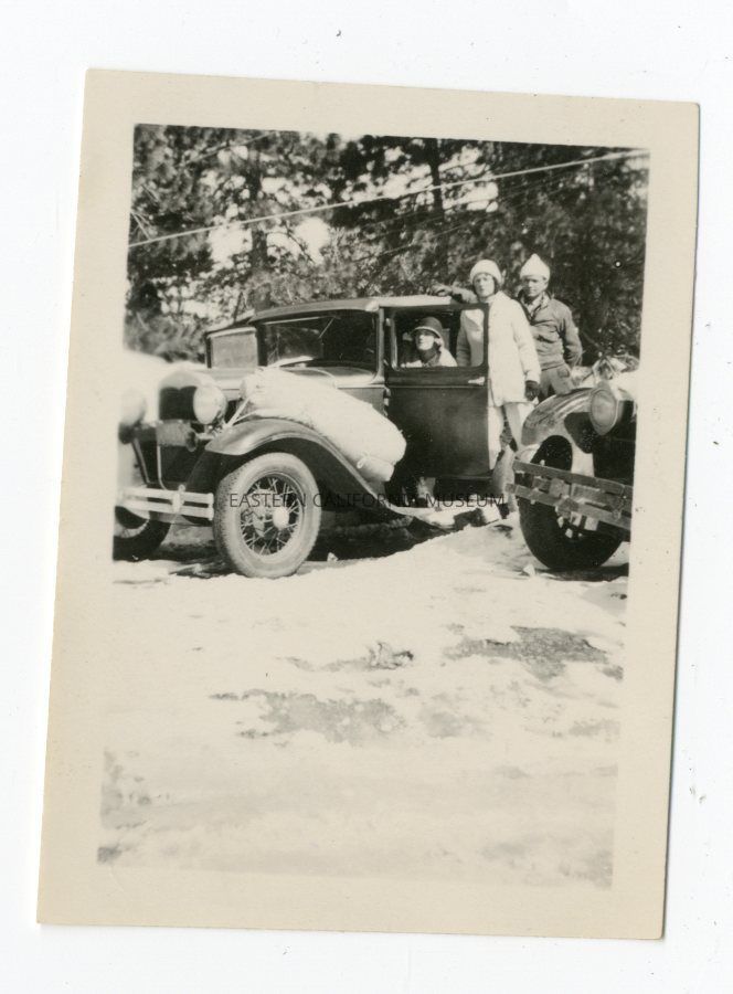 Photo of three people next to an early vehicle that has a large amount of snow on it's fender. There is snow on the ground and another vehicle to the right side. Location unknown.