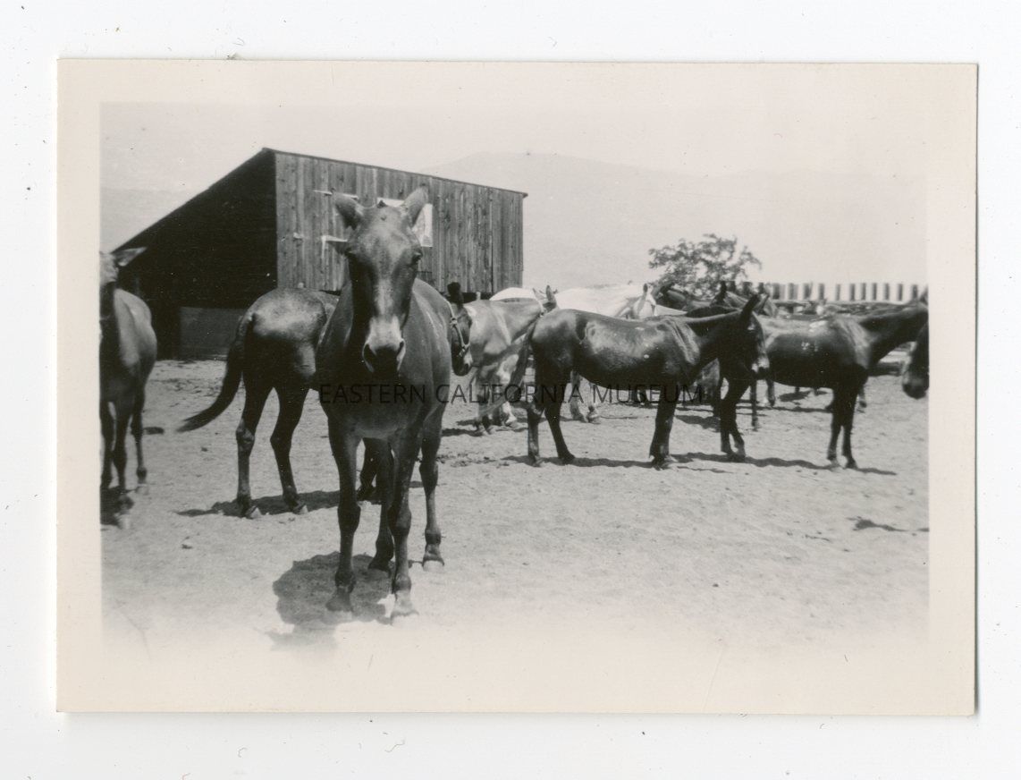 Photo of a bunch of horses and/or mules in a corral. There is a wood shed or outbuilding in the background.