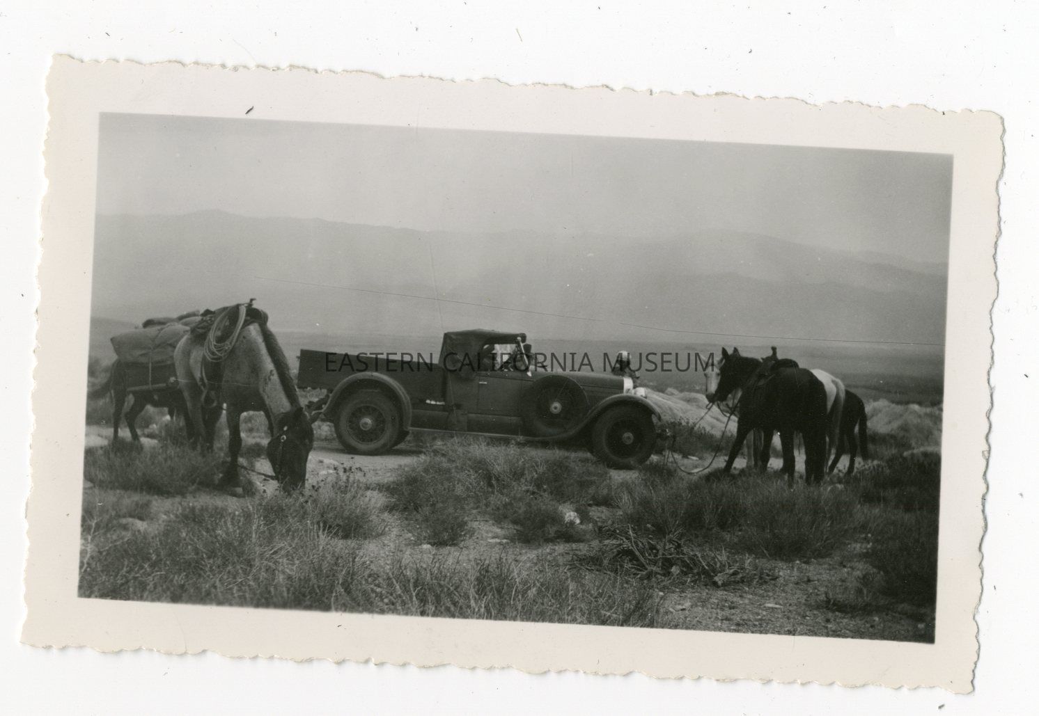 Photo of an early pickup truck and several horses and pack mules. The horses appear to be tethered to the front bumper.