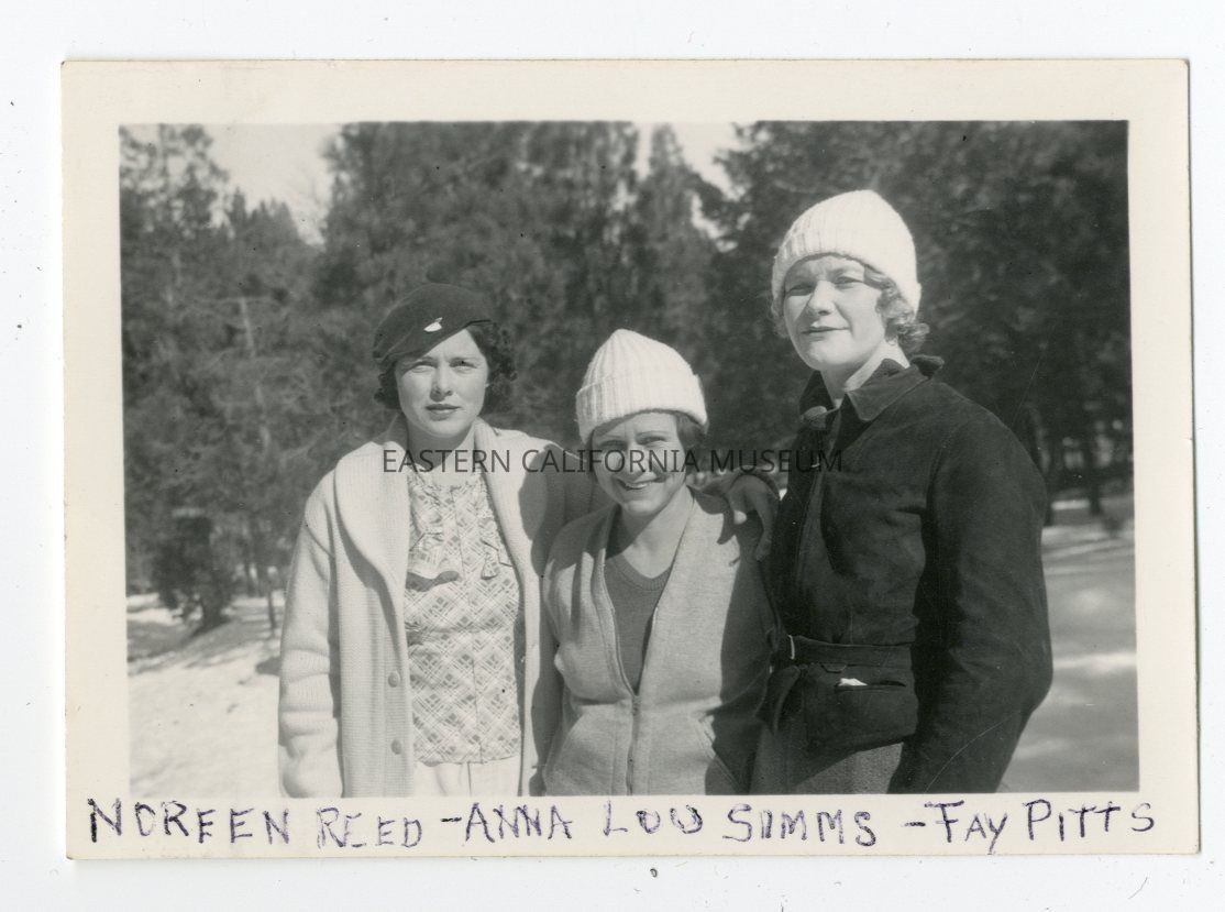 Photo of three women in a snowy landscape. Written along bottom edge is "Noreen Reed, Anna lou Simms, Fay Pitts."