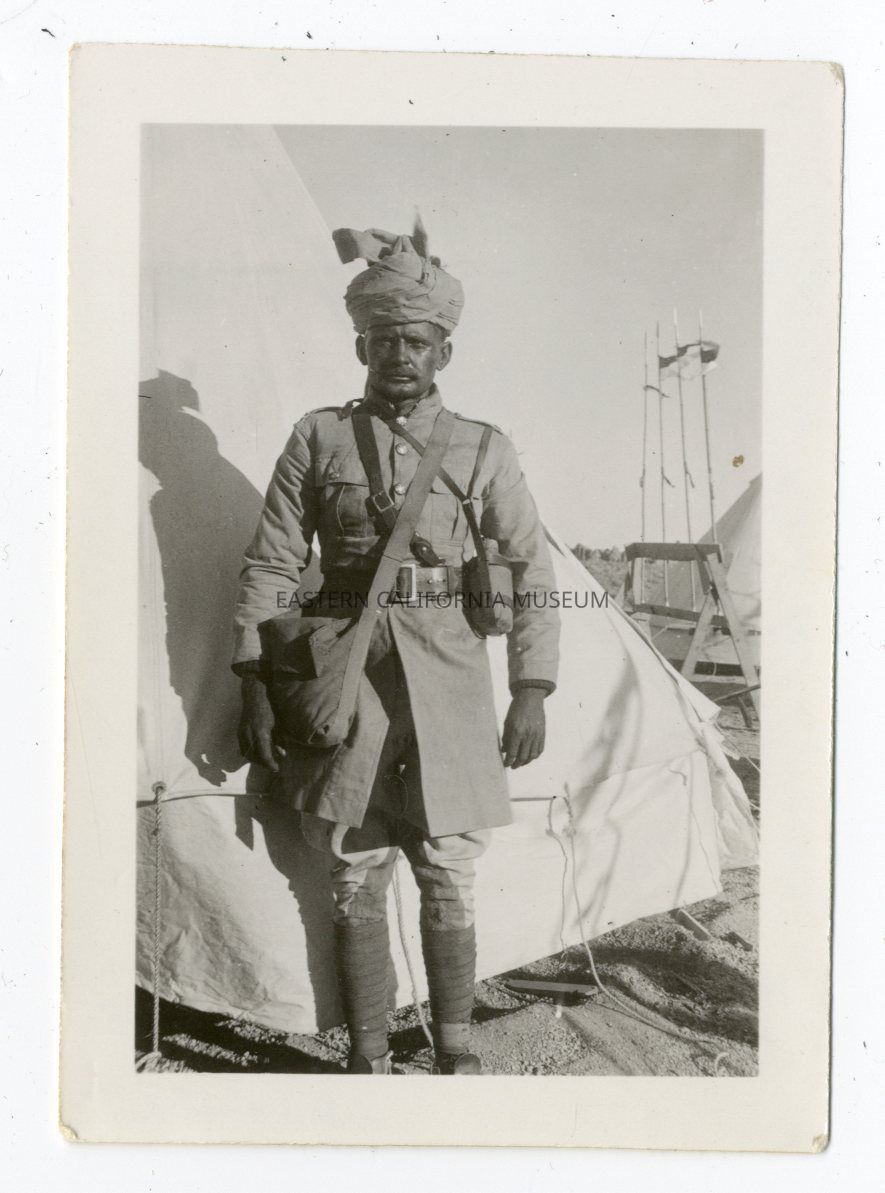 Photo of an actor wearing a costume military uniform. There is a tent and rack of spears in the background.