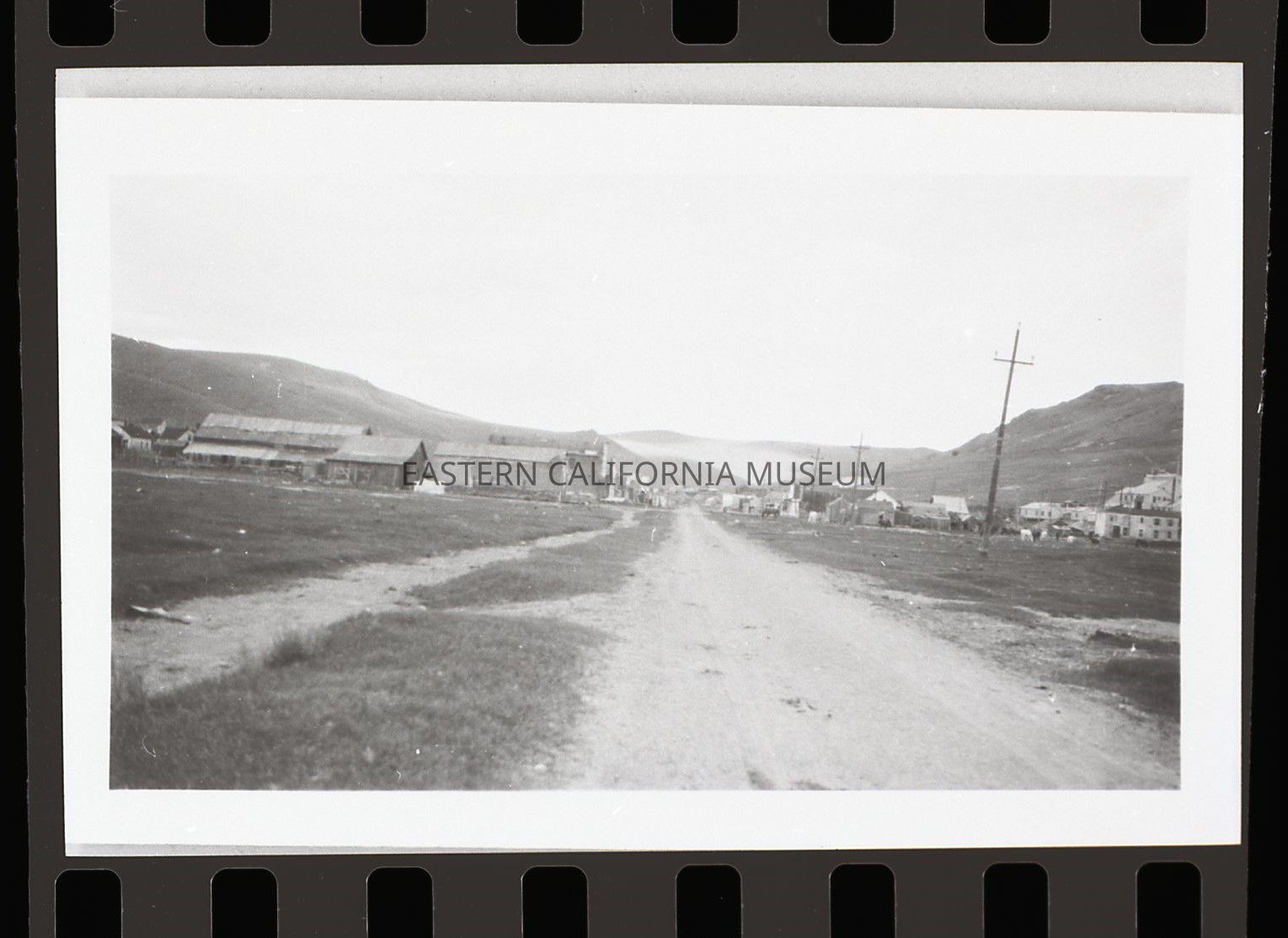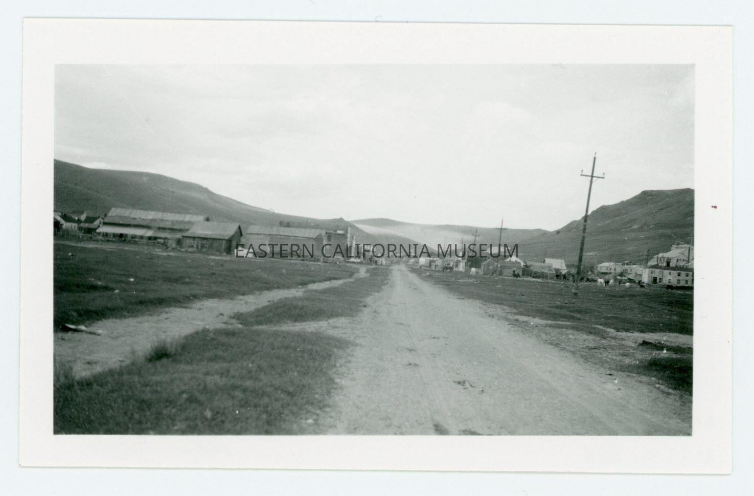 Copy of a photo of a dirt road leading through a town. It is likely Bodie. Date of photo may be circa 1923.