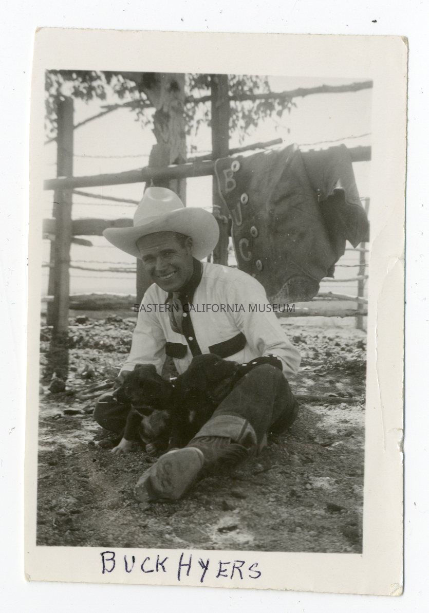 Photo of a man sitting on the ground with a fence or corral behind him. His chaps are hung on the fence, and they have "Buck" on them. Written in black ink along bottom edge is "Buck Hyers."