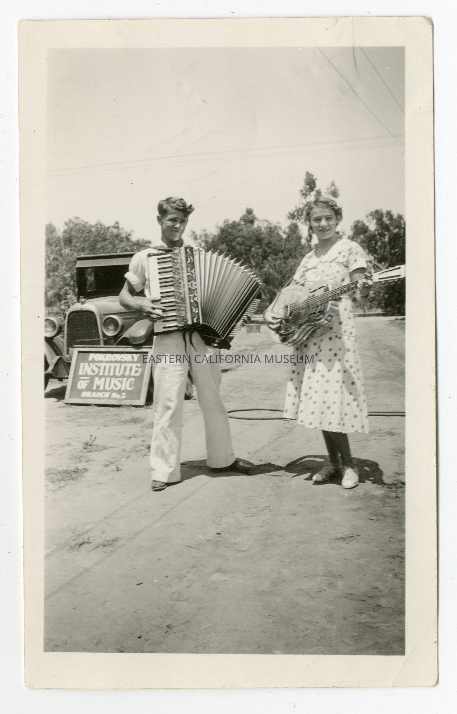 Photo of a young couple playing instruments on the side of a dirt road. The young man is playing an accordion and the young woman is playing a guitar-like instrument. There is an early vehicle parked in the background and a sign propped up against its front fender that says "Pokrovsky Institute of Music, Branch No. 2."