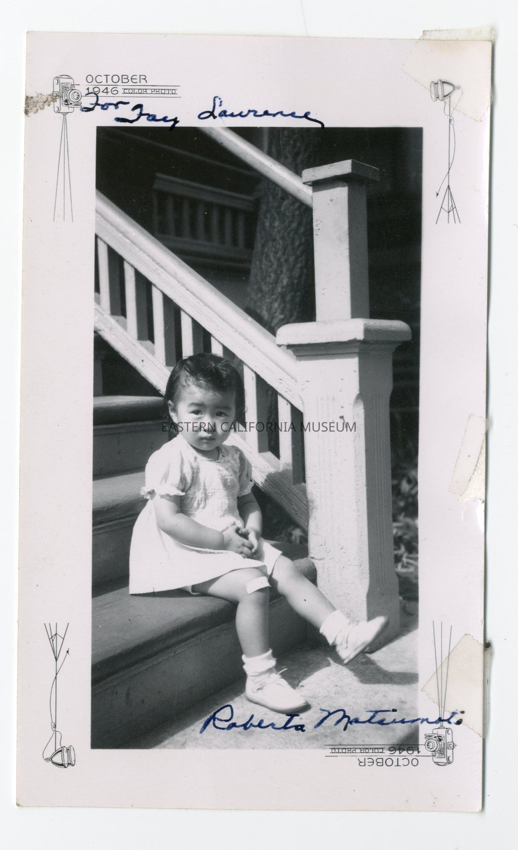 Photo of a little girl sitting on the bottom step. She is wearing a white dress and has a bandaid on her right knee. Written in ink along top and bottom edges is "For Fay Lawrence, Roberta Matsumoto." The photo is printed with the date October 1946.