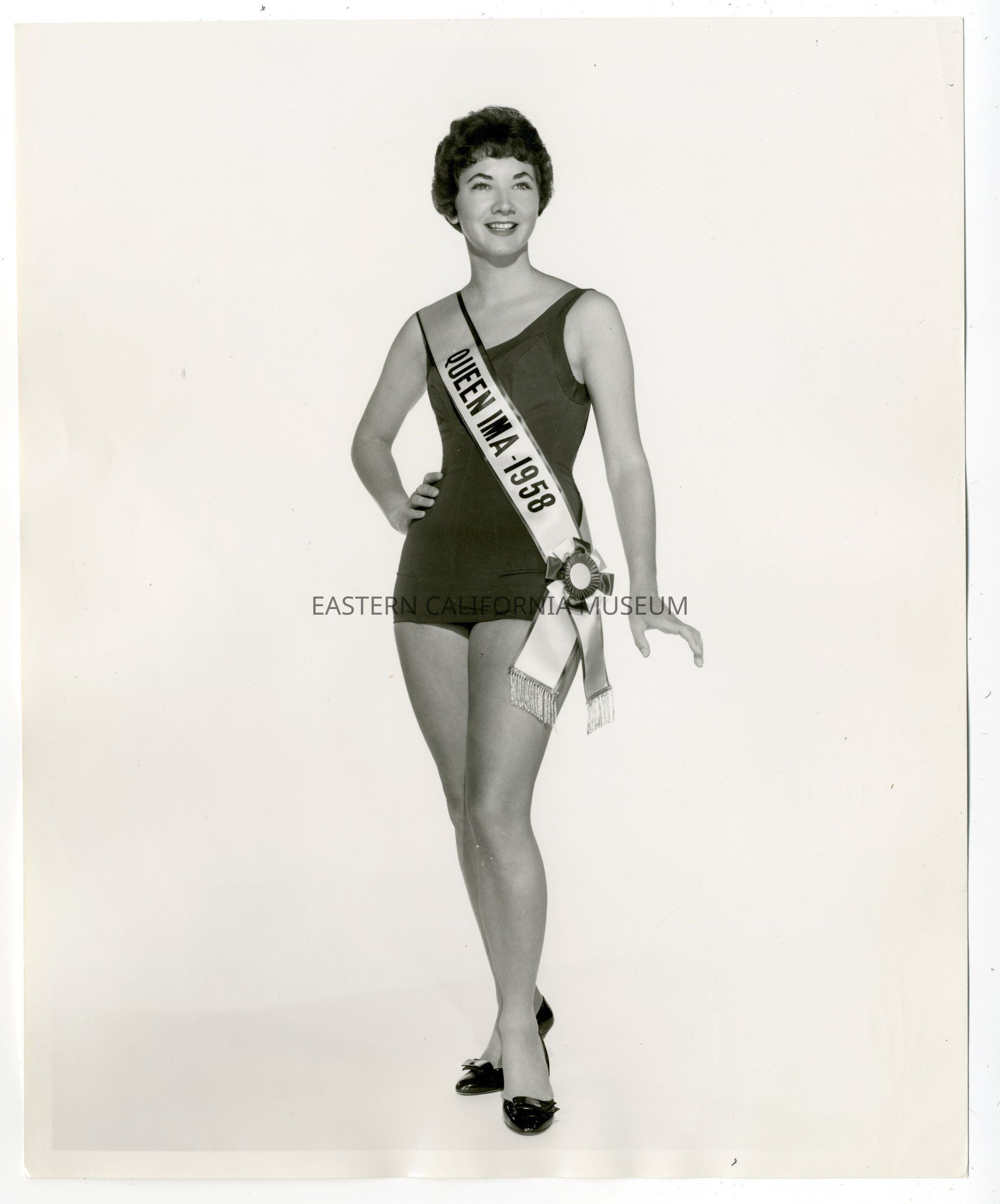 Professional studio portrait of a woman in a swimsuit. She is wearing a sash that says "Queen IMA 1958." Written in pencil on reverse: From Fay Lawrence.
