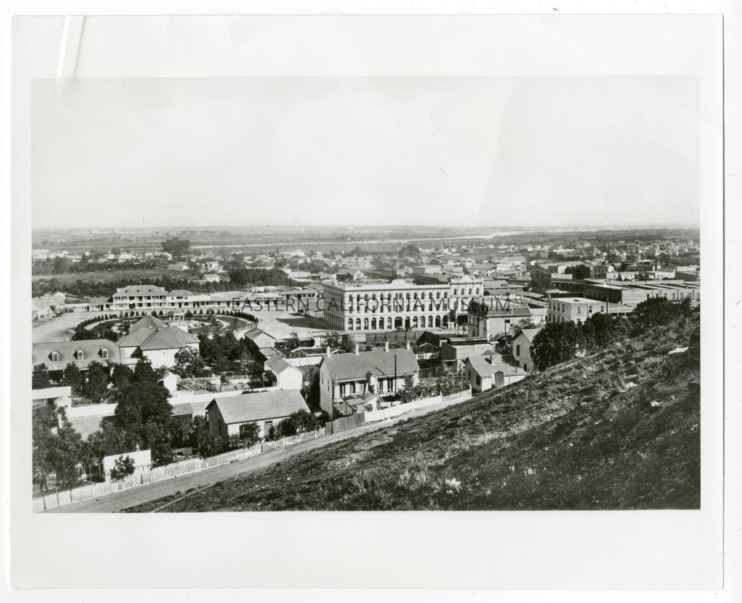 Photo of the City of Los Angeles in its early days, possibly circa 1880s. Stamped in black ink on reverse with the Dept. of Water & Power stamp and photograph/negative number 57-1281.