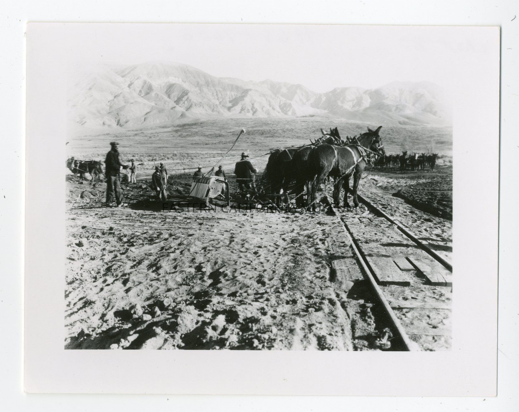 Photo of Los Angeles Aqueduct laborers with a team of horses by railroad track. Location may be the Aberdeen area (see lava flow in background).