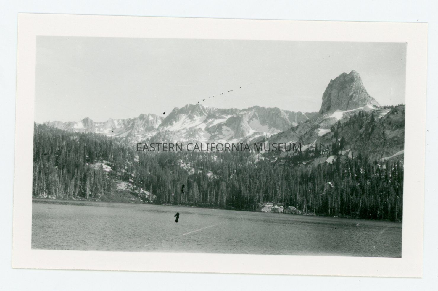 Copy of a photo of Crystal Crag and lake. Date of photo may be circa 1923.