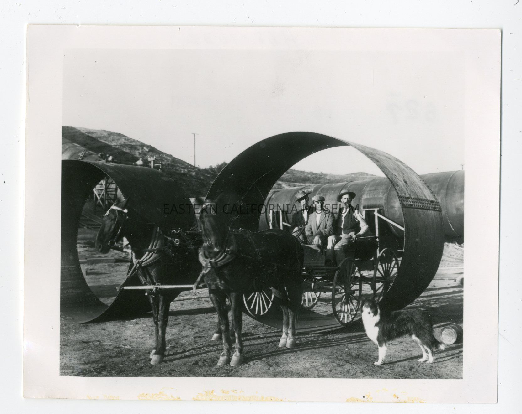 Photo of three men, likely aqueduct laborers, in a horse drawn wagon or buggy posing inside of a section of pipe used to construct the Los Angeles Aqueduct. There is a dog in the lower right corner