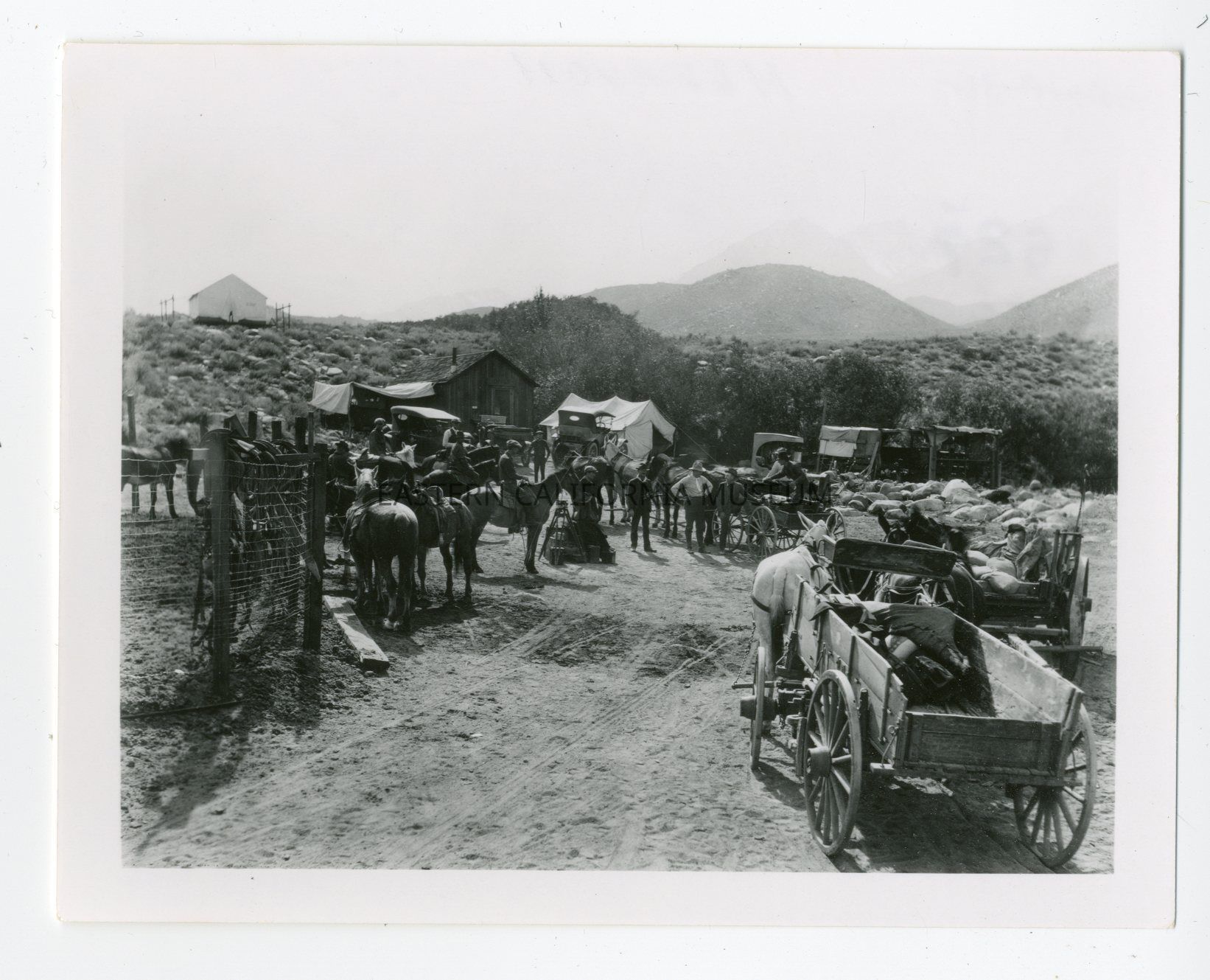 Photo of wagons, horses, men, early vehicles (center), and tent houses at a Los Angeles Aqueduct construction camp.