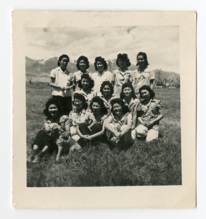 From Genzo Nishida's pics. Exterior photograph of thirteen young women in three rows (with dog), with Sierra Nevada behind them. This is part of a picnic event at South Park south of Manzanar.Photograph Details