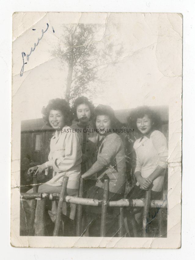 From Louie Sakamoto's photos. Exterior photo of four women sitting along a wood log fence with barrack in the background. Written on front is, "Louie, [illegible name]."Photograph Details