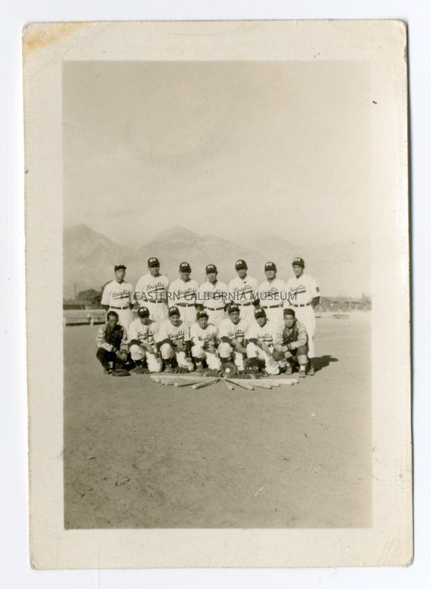 From Louie Sakamoto's photos. Exterior photo of the Manzaknights baseball team in uniform.Photograph Details