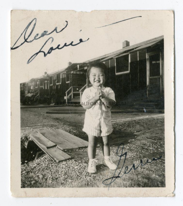 From Louie Sakamoto's photos. Exterior photograph of young girl standing and smiling at the photographer with barracks type buildings behind her. Photograph is not from Manzanar. On front of photo is written: "Dear Louie, Gerrie."