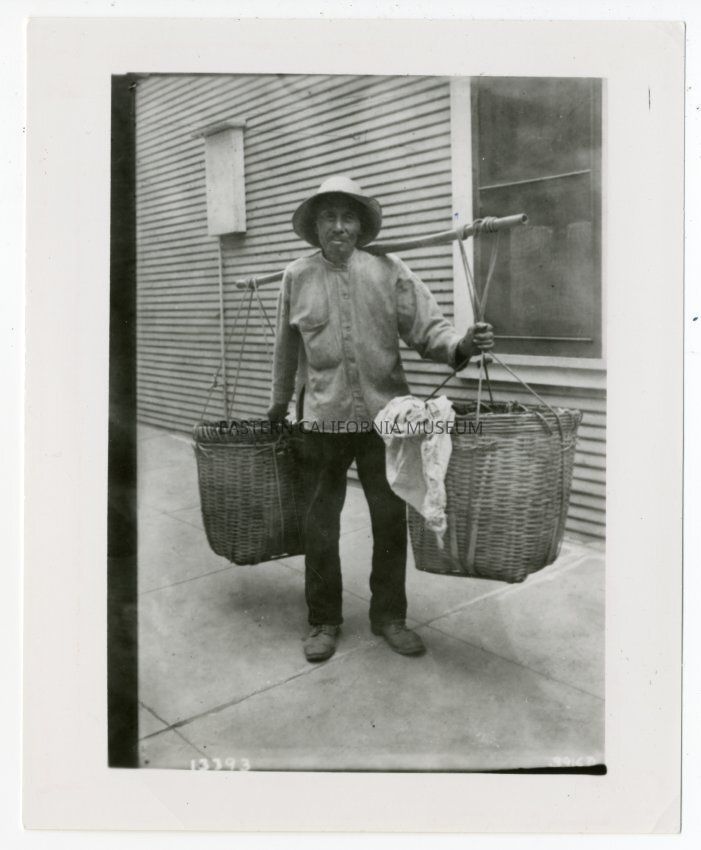 A man is holding two large baskets hanging from a pole across his shoulder. He is standing in front of a building. A. A. Forbes, Photographer.