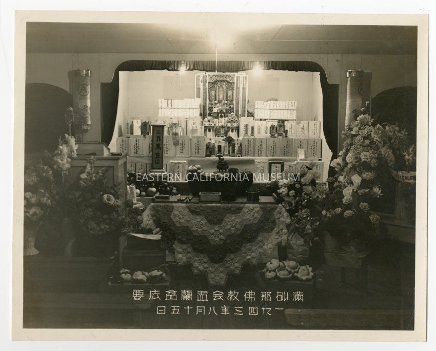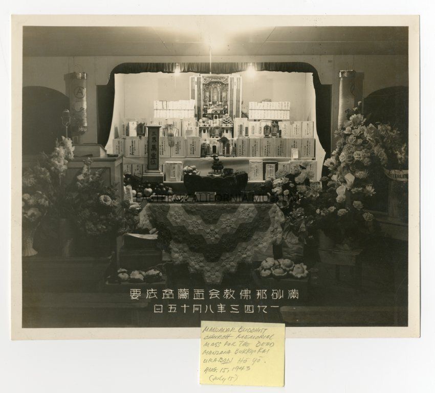 A yellow sticky note with this photo says: Manzanar Buddhist Church memorial mass for the dead. Manzanar Bukkyo Kai Urabon Ho Yo, Aug. 15, 1943. (July 15).Photograph Details