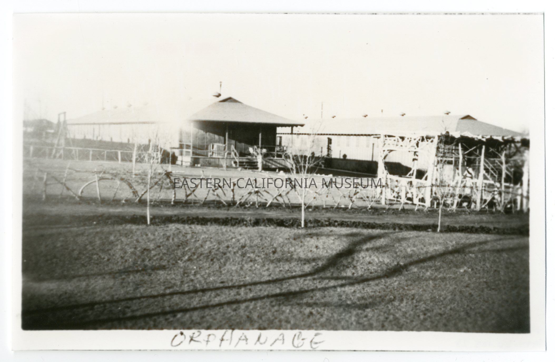 Copy of a photo of the Children's Village at Manzanar War Relocation Center. Written along bottom edge is "Orphanage."