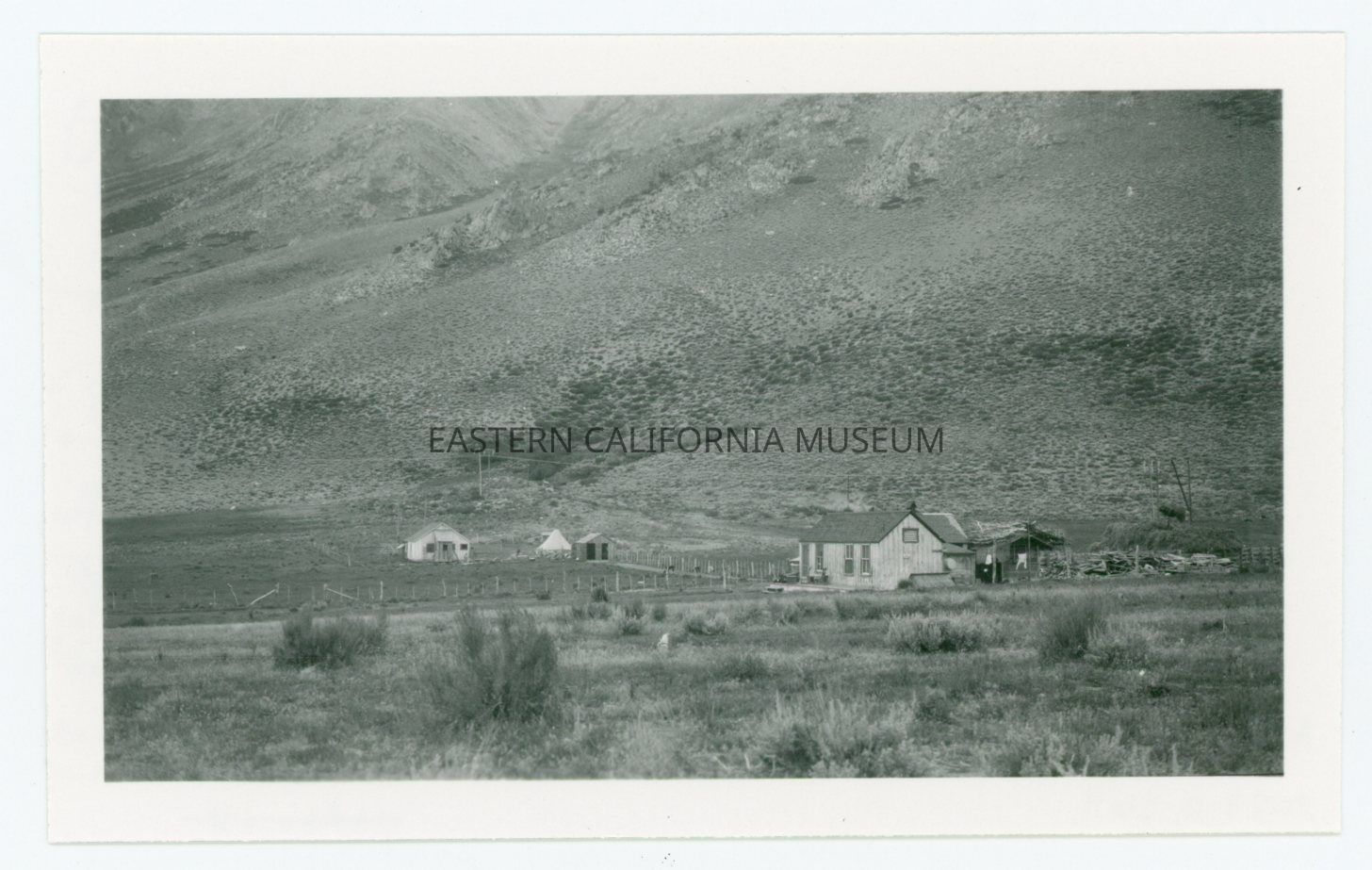 Copy of a photo of a ranch with several buildings at the base of a mountainside. Date of photo may be circa 1923. Written in pencil on reverse: Ranch (out of Bodie?).
