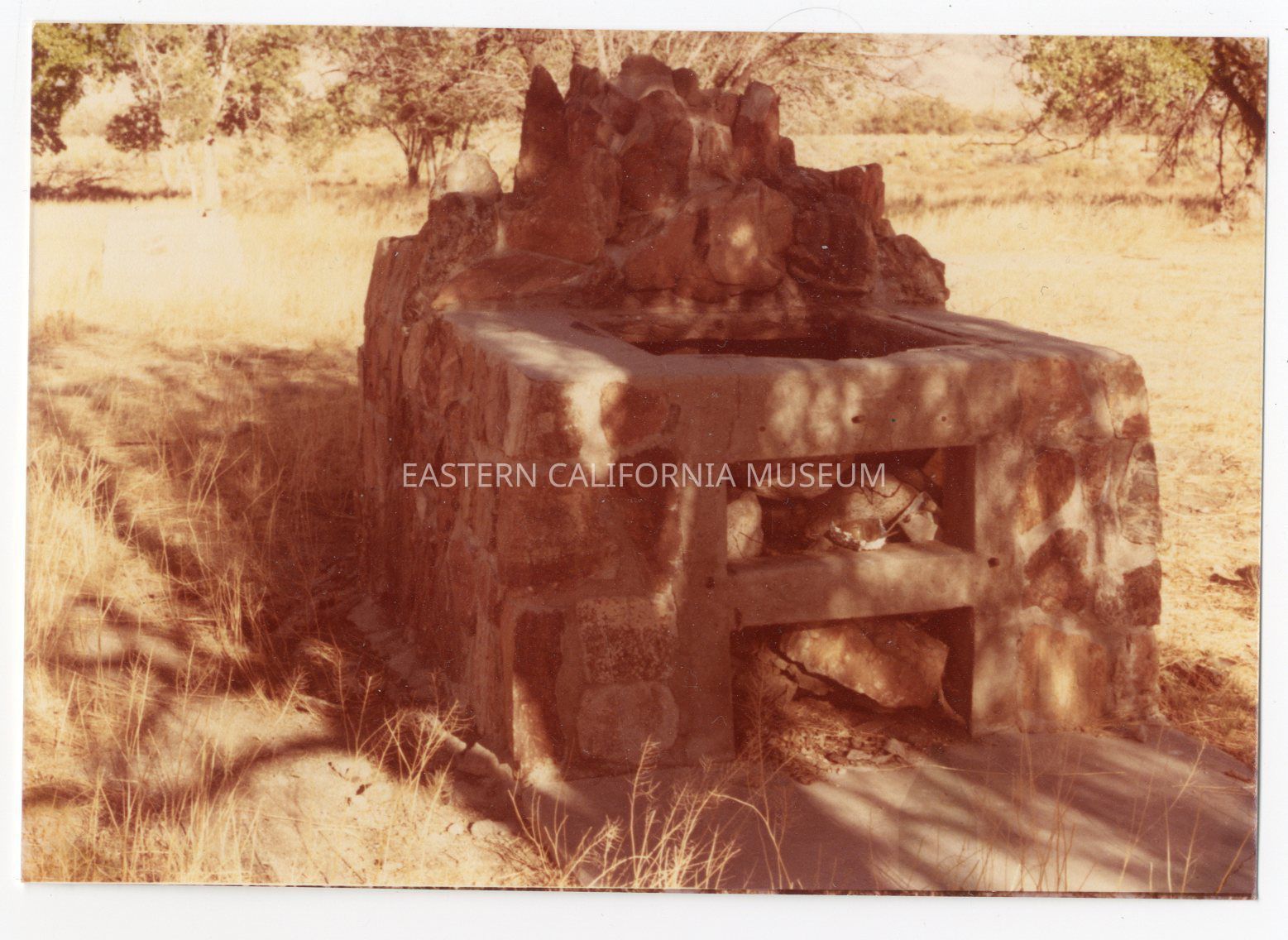 Color photo of a stone and concrete fireplace at Manzanar War Relocation Center.