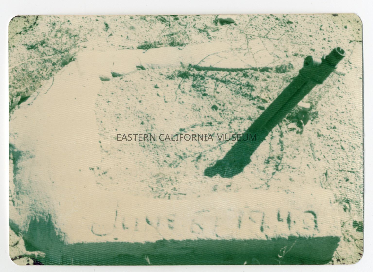 Color photo of what may have been a water spigot at Manzanar War Relocation Center. The date "June 6, 194_" is carved into the concrete base.Photograph Details
