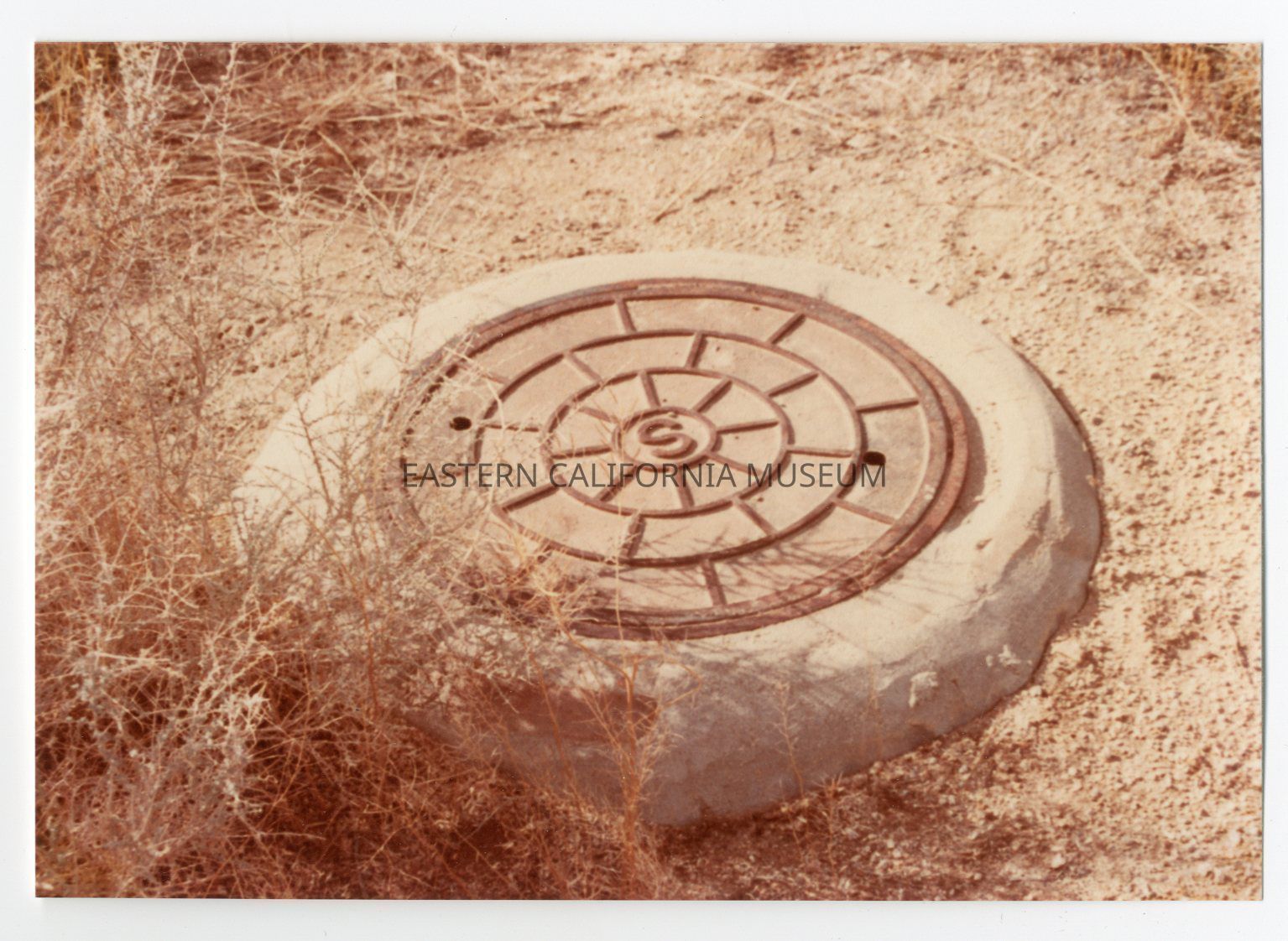 Color photo of a sewer manhole cover at Manzanar War Relocation Center.