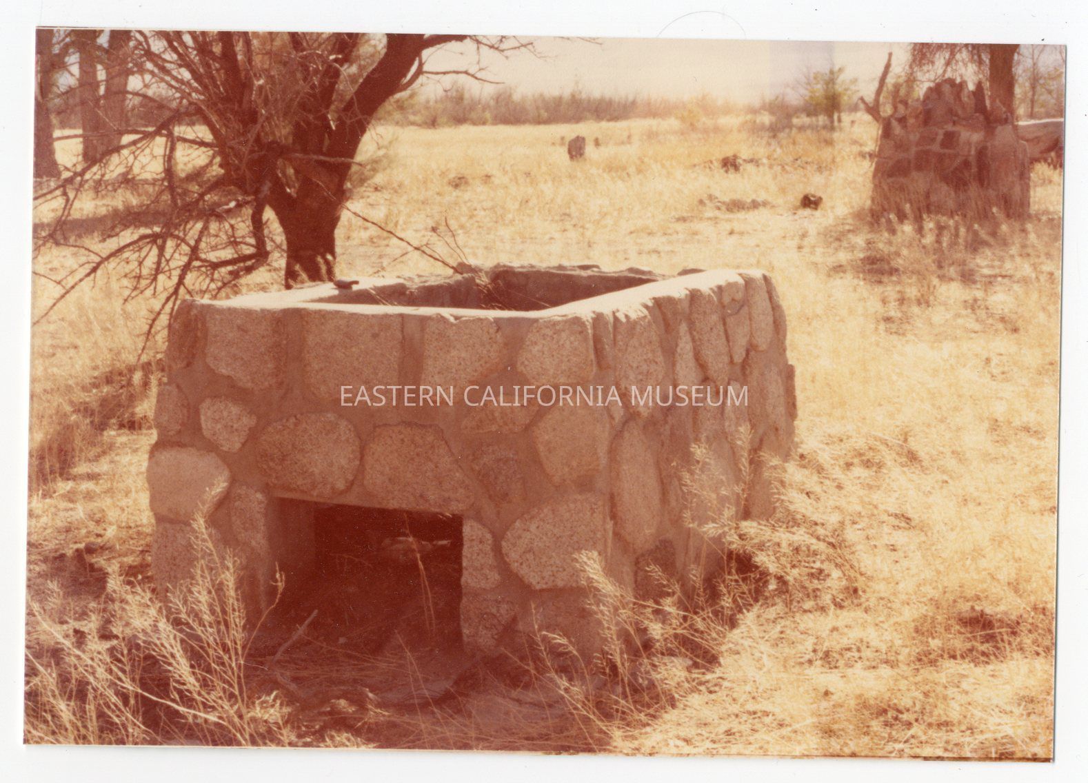 Color photo of what looks like a fireplace made from stones and concrete at Manzanar War Relocation Center.