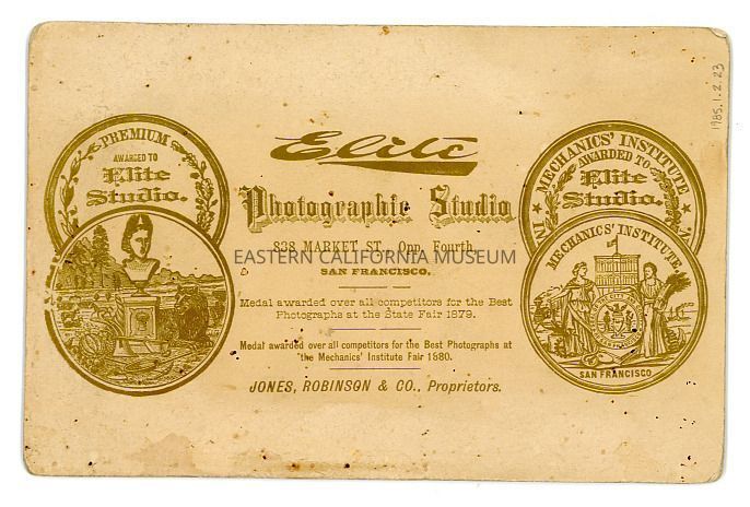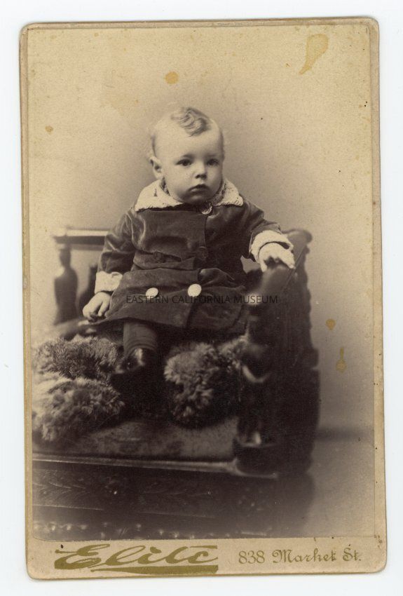 Mounted studio portrait of a baby sitting on a chair. Photographer was Elite Studio of San Francisco. Jones, Robinson, and Co., Proprietors.