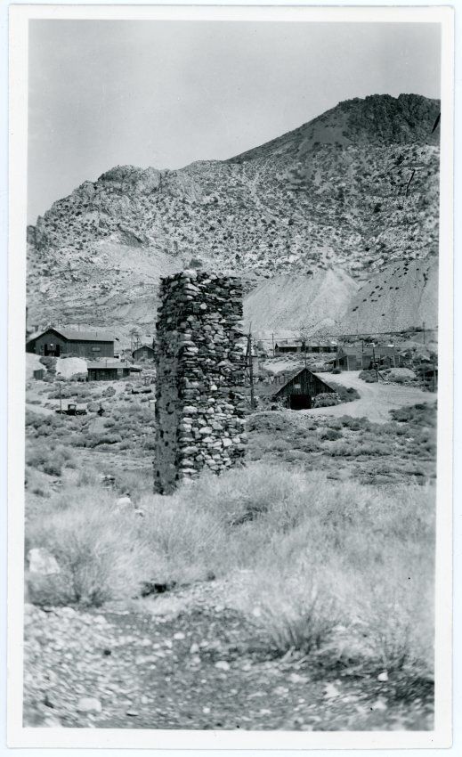 Photo of the remains of a large chimney, possibly Victor Belshaw's smelter, at Cerro Gordo. There are many other buildings in the background.