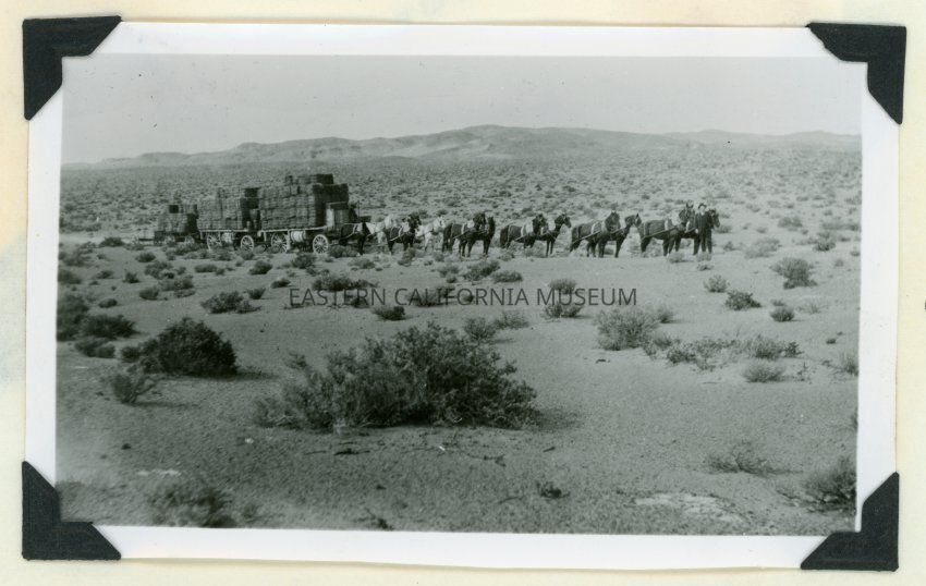 Photo of a team of twelve horses or mules hauling three large wagons of hay from Keeler to Cerro Gordo, about 1910. There is an unidentified man standing next to the lead team. Photo was copied in 1959 courtesy of L. Hilderman.