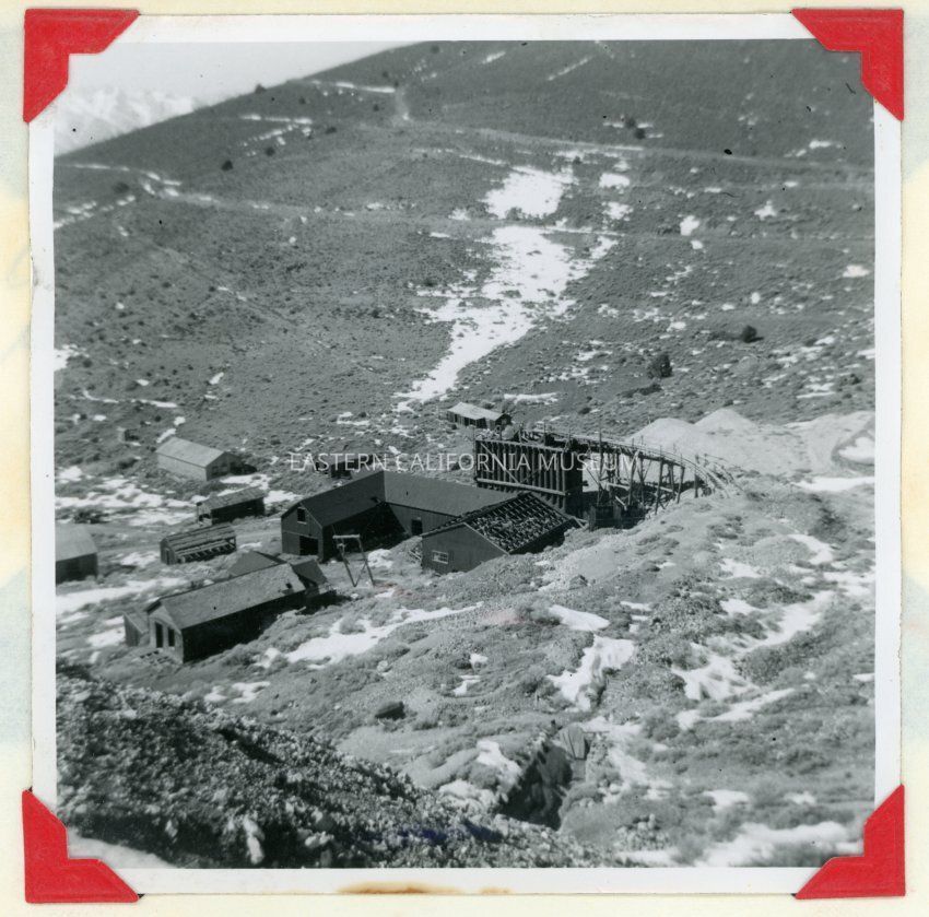 Photo taken from the ore dump of the tram house at Cerro Gordo and bins. Photo taken in April 1956 by W. P. Payne.