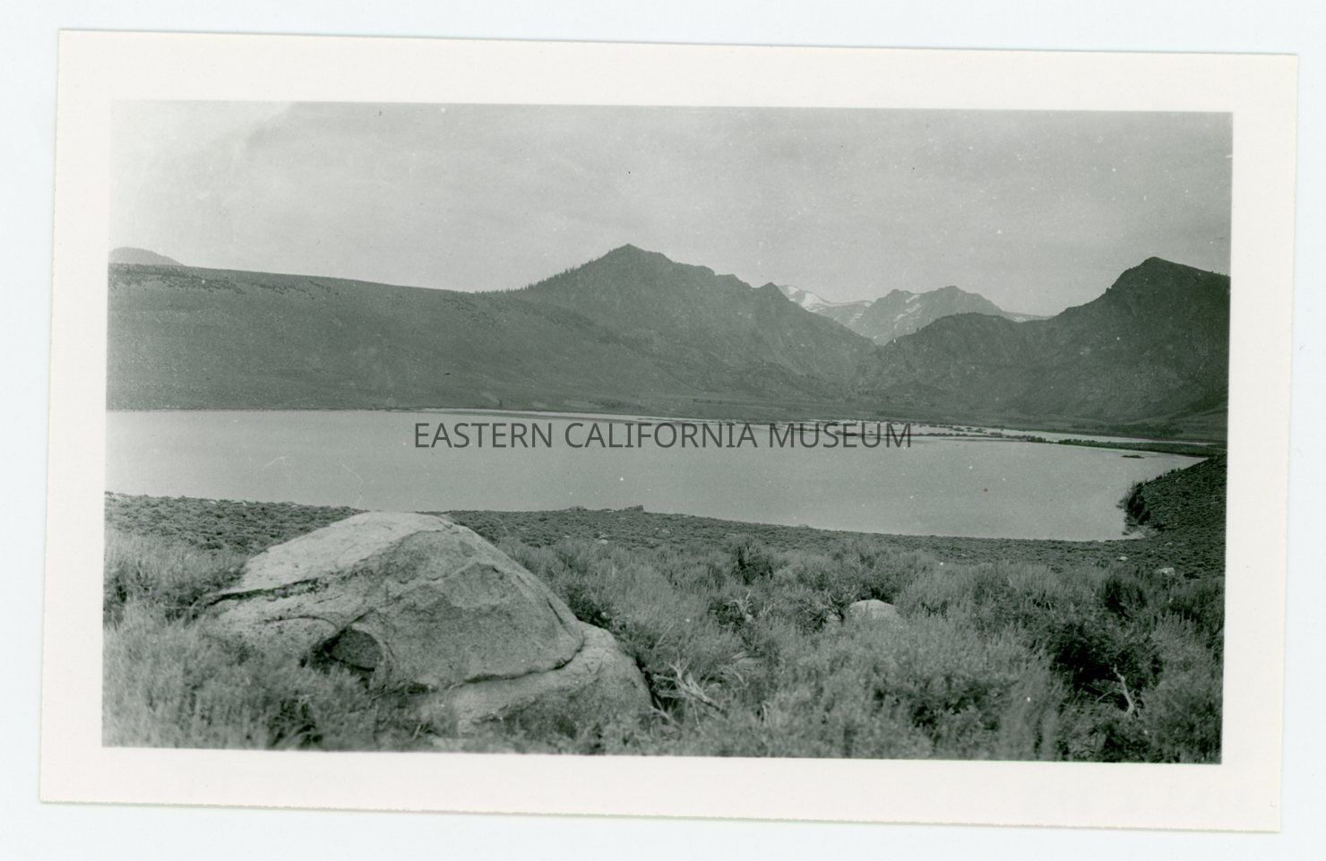 Copy of a photo of a lake with mountains in the background. There is a large boulder in the foreground. Date of photo may be circa 1923. Written in pencil on reverse: Bridgeport Lake.