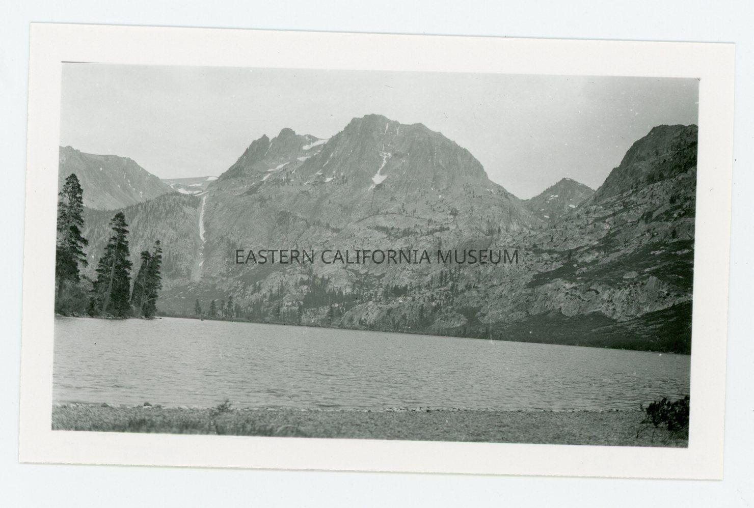 Copy of a photo of a lake with mountains in the background. Location may be somewhere in Mono County and the date of photo may be circa 1923.
