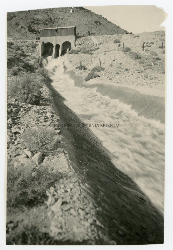 Photo of water flowing down a spillway from the Alabama Gates near Lone Pine. Possibly taken during the Occupation of the Alabama Gates in November 1924.
