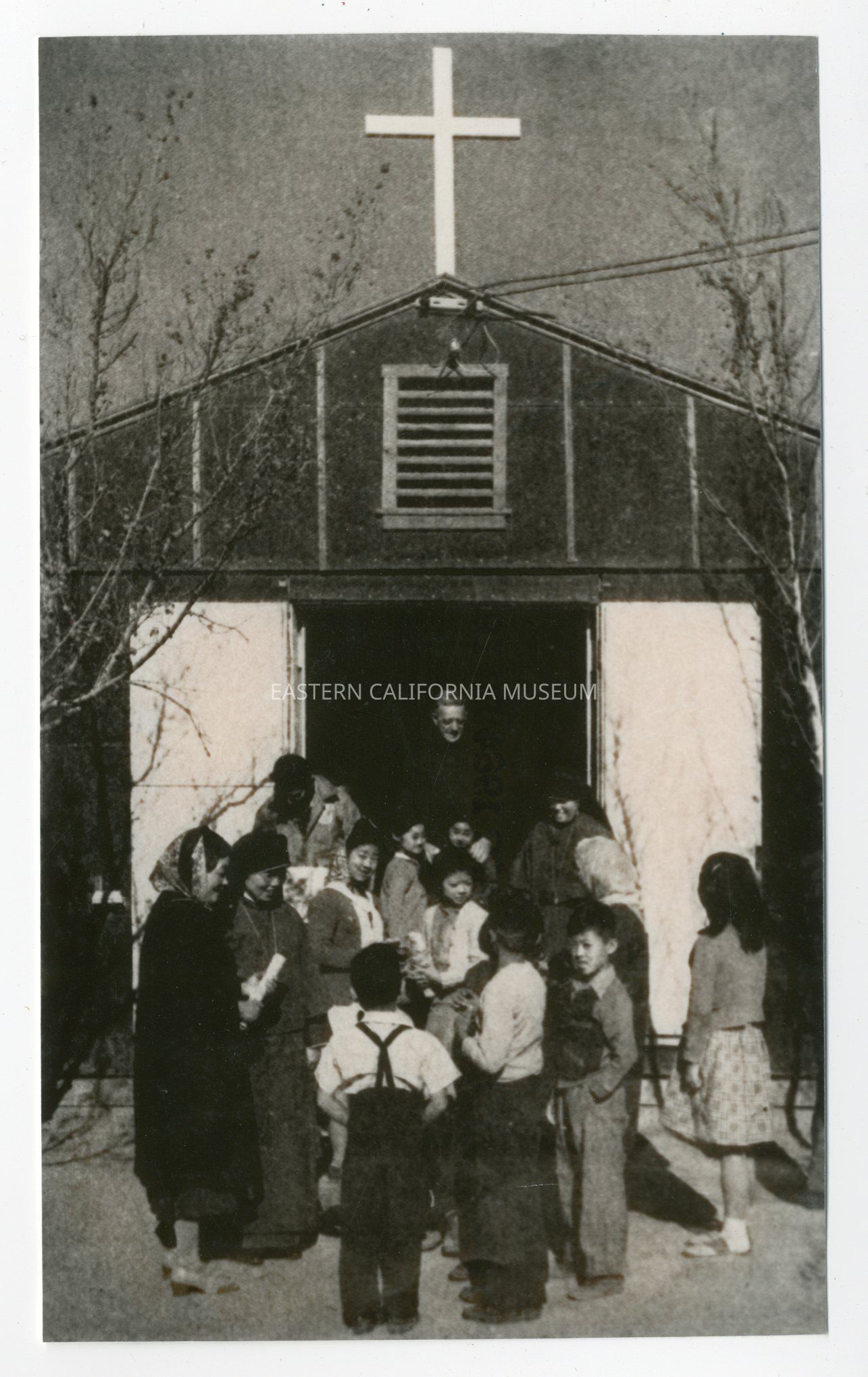 Copy of a photo of a group of people clustered around the entrance of a church. There is a caucasian man inside the doorway, and a woman who appears to be a nun. This copy was printed in April 1984.Photograph Details