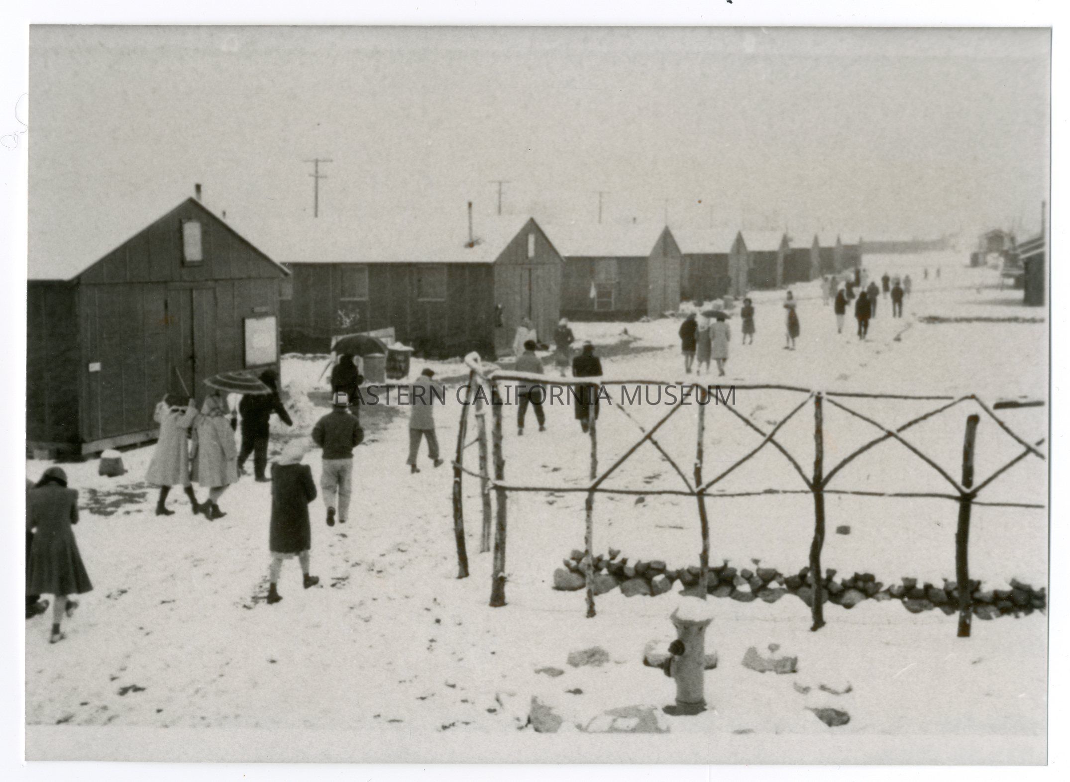 Copy of a photo of Manzanar War Relocation Center covered in snow. Photo shows people walking, mostly away from the camera, along a long row of identical barracks. There is a fire hydrant in the foreground. This copy was printed in April 1984.Photograph Details