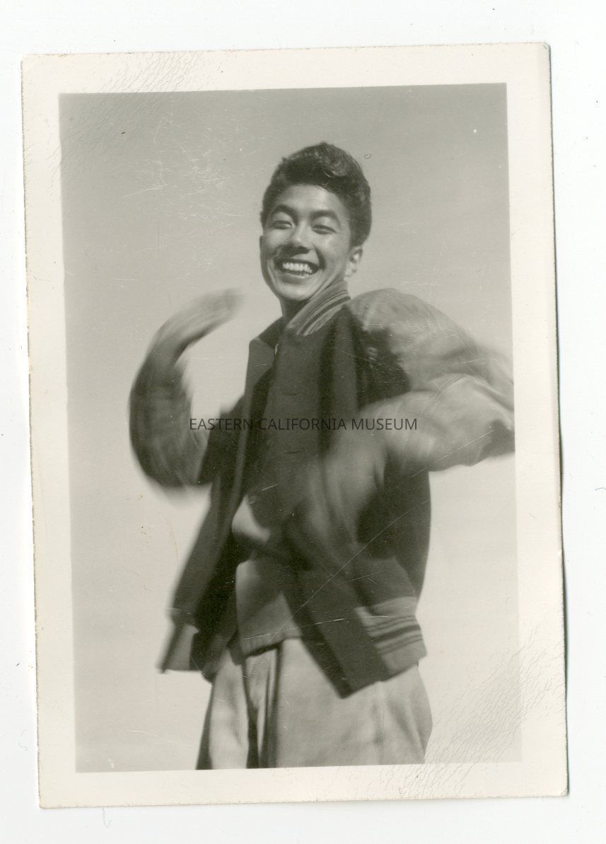 Photo of a young man wearing a letterman's jacket. He moved his arms as the photo was taken so they are blurry.Photograph Details