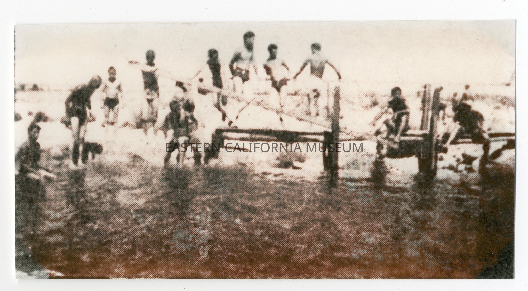 Copy of a photo of a group of people in swimsuits at the edge of a body of water. Possibly the reservoir at Manzanar War Relocation Center? This copy was printed in April 1984.Photograph Details
