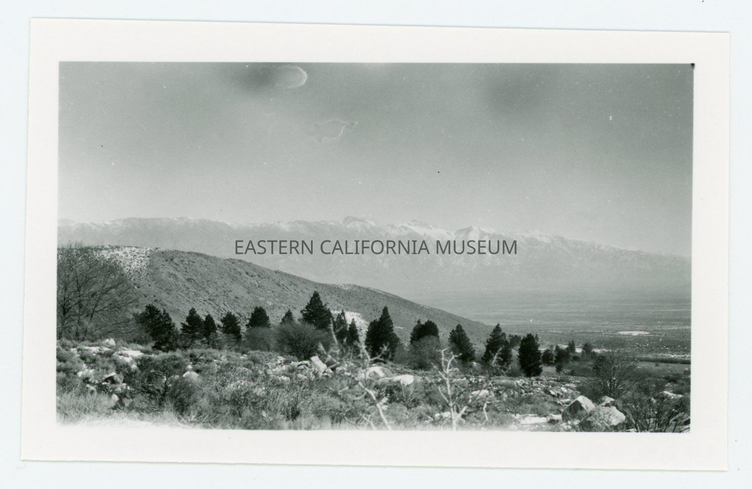 Copy of a photo of the landscape with a row of pine trees in the foreground and mountains in the background. It has been identified as the Seven Pines area up Onion Valley Road out of Independence.