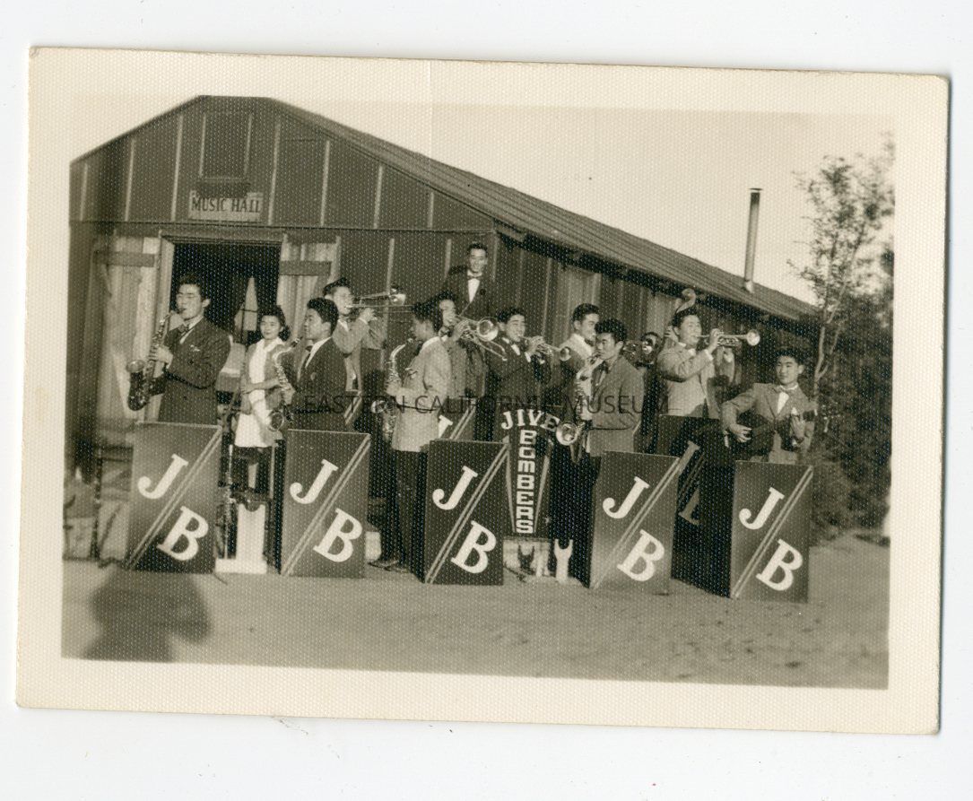 Photo of the Jive Bombers band at Manzanar War Relocation Center. They are in front of the Music Hall barrack and they are "playing" their instruments for the photo.Photograph Details