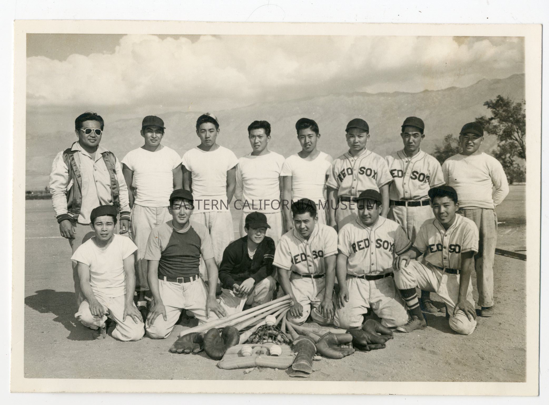 Photo of 14 men, five of which are wearing Red Sox baseball uniforms, posing with baseball bats, mits, balls, and catcher's gear.