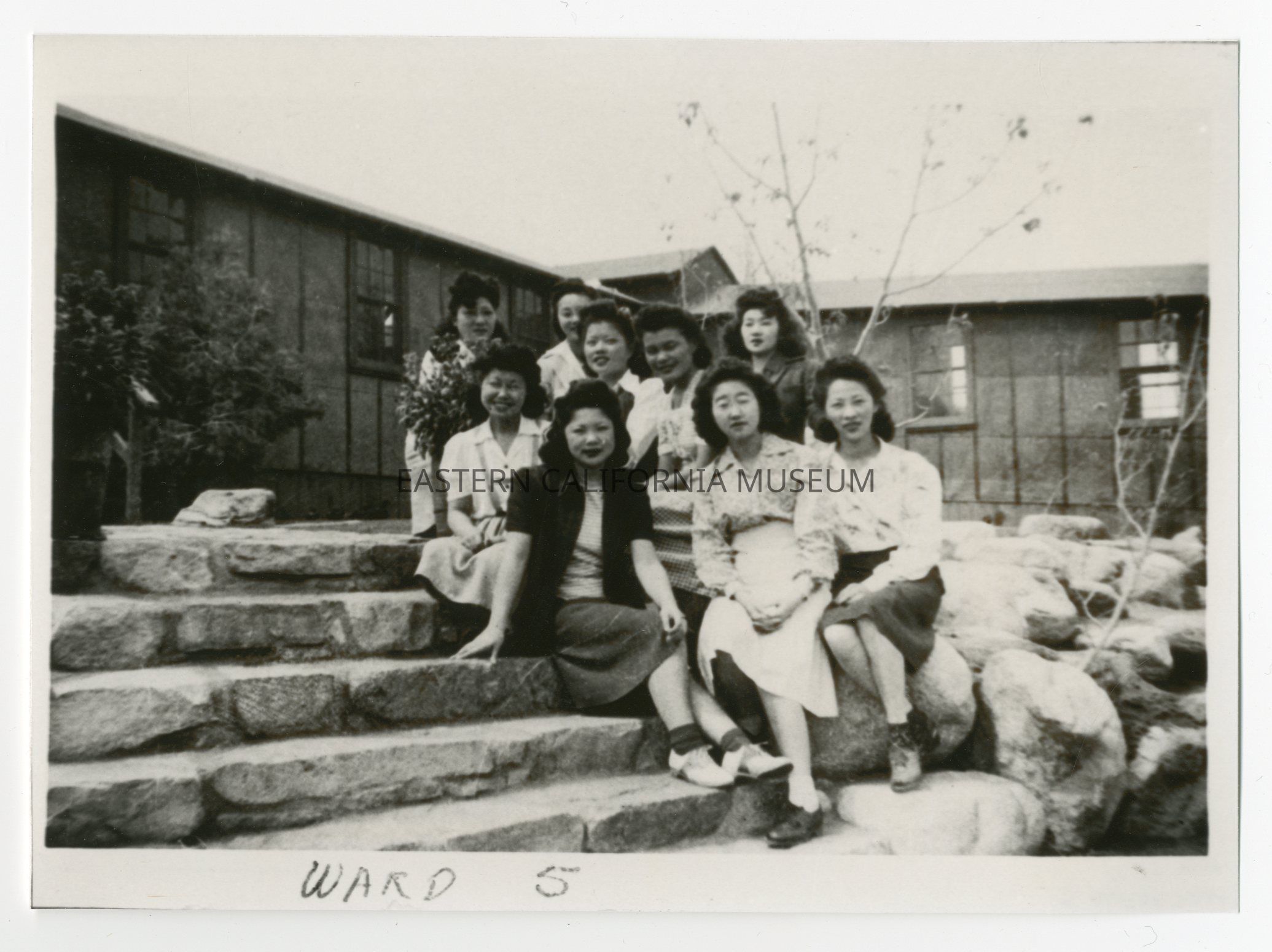 Copy of a photo of nine women sitting on stone steps in front of Ward 5 at Manzanar War Relocation Center. This copy was printed in March 1984.