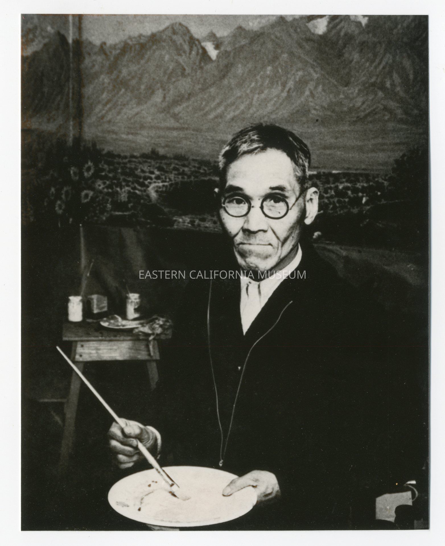 Copy of a photo of a man holding a paintbrush and palette in front a mural. This mural is the center part of a triptych that is in the collection of the Eastern California Museum (2020.2.1, 2020.2.2, 2020.2.3). This copy was printed April 1984.Photograph Details